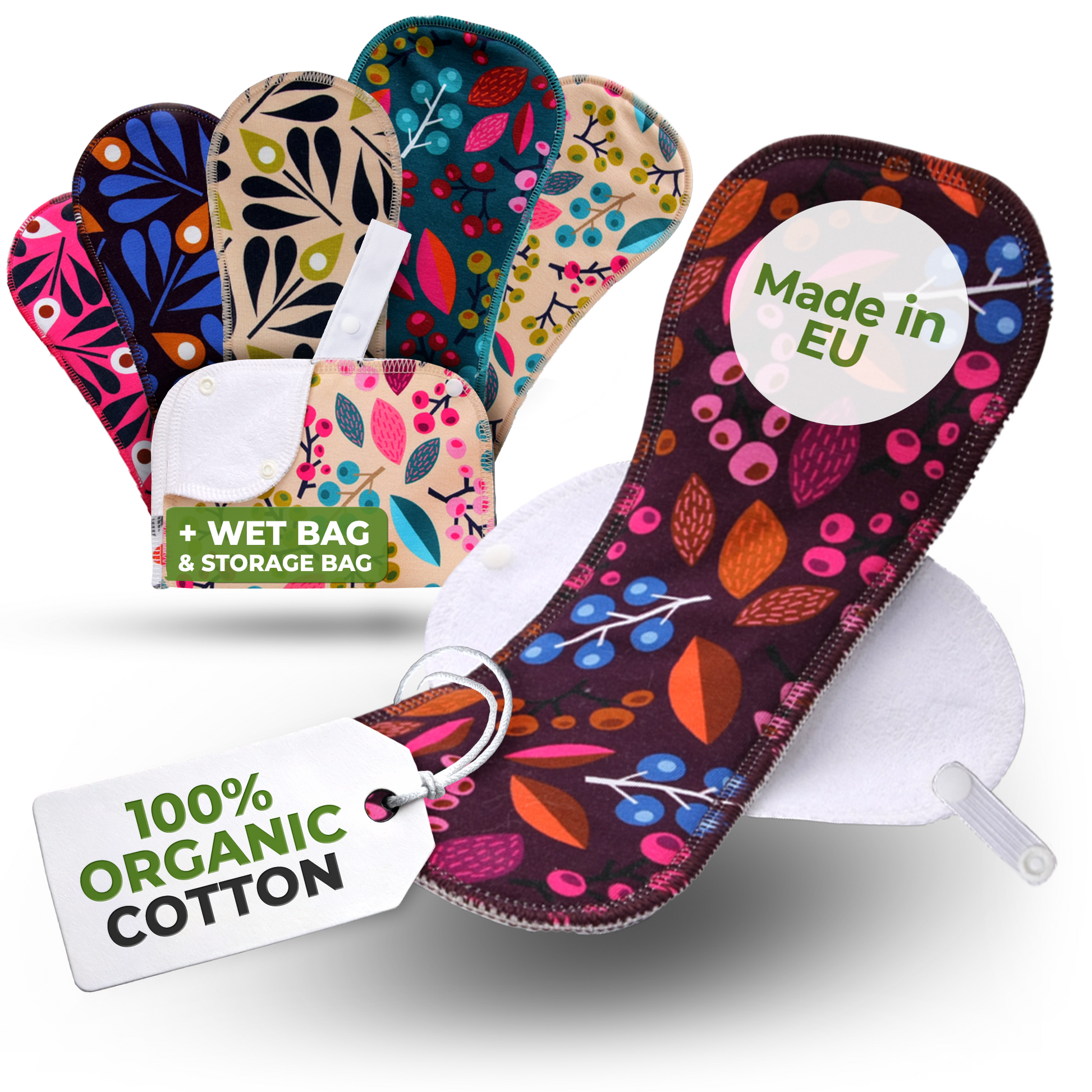 Organic Cotton Reusable Menstrual Pads with Wings 6-Pack (Sizes L & XL) - Grapes & Peacock (white wings)